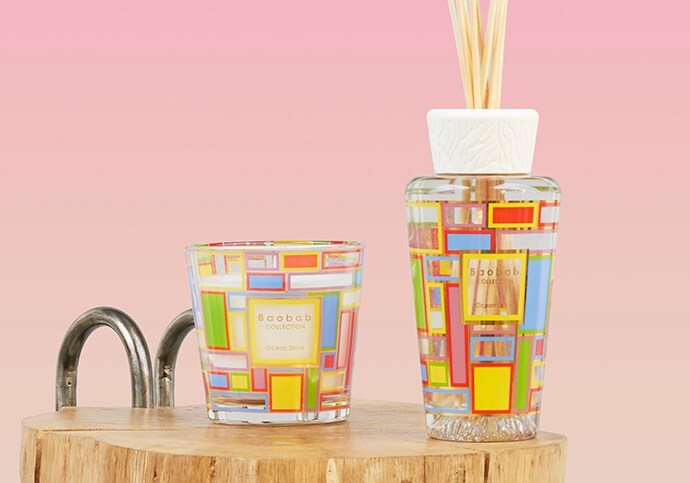La vela aromática y el difusor Ocean Drive están decorados con un diseño gráfico serigrafiado inspirado en el artista Peter Halley. El diseño de la vela y el difusor es una interpretación abstracta de los colores de neón de los escaparates de Ocean Drive. El aroma de la mandarina y el cedro le transportará directamente a la vibrante atmósfera de la ciudad.