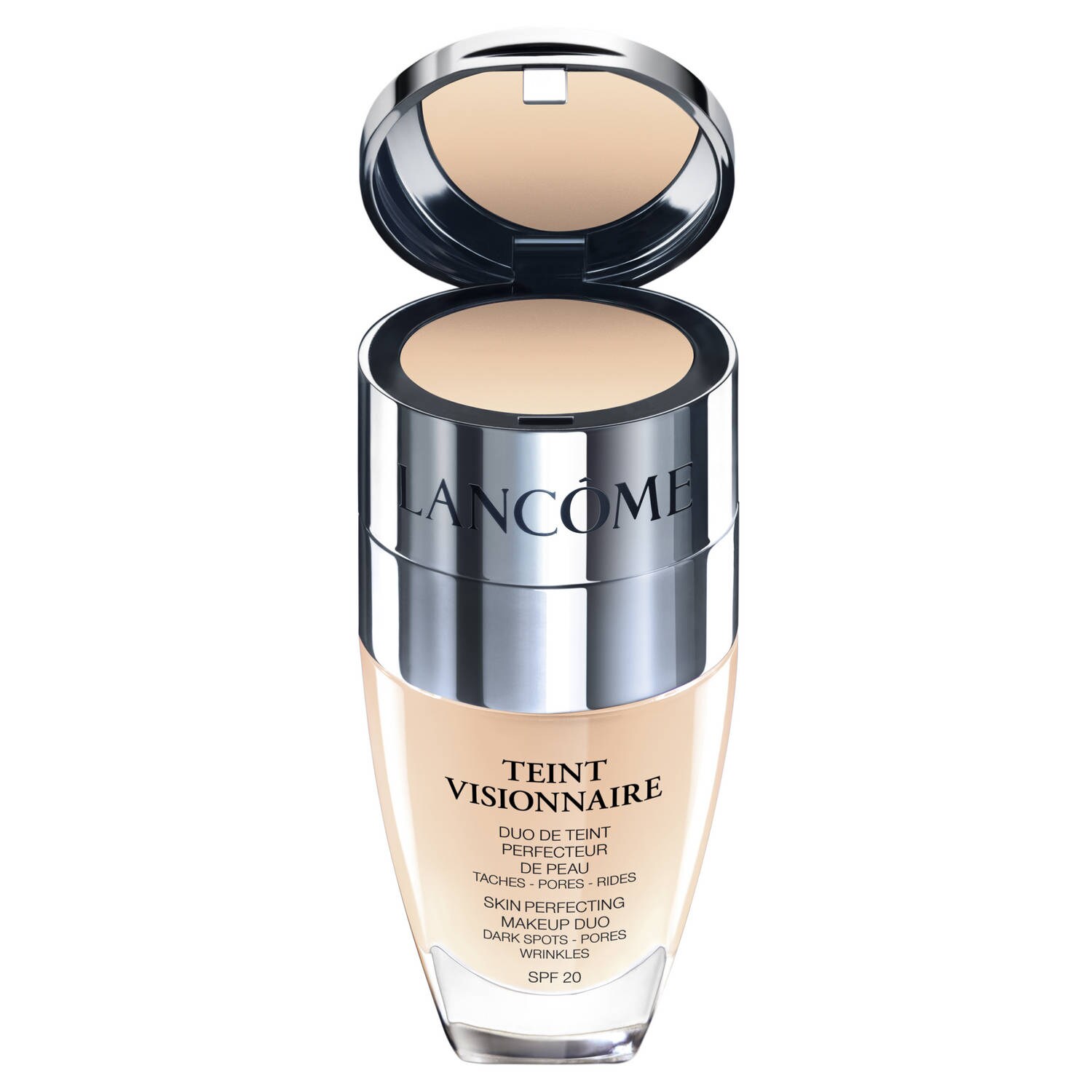Lancôme presenta un dúo de maquillaje perfeccionador de la piel, Teint Visionnaire, una base de maquillaje correctora y perfeccionadora. Unifica el rostro con una alta cobertura a la vez que brinda las propiedades y beneficios anti edad de un tratamiento. Una base de maquillaje que integra en la parte superior un corrector que permite corregir manchas oscuras, poros y arrugas. Una fórmula enriquecido con [LR 2412], el ingrediente activo de los tratamientos de la gama Vissionaire, la base de maquillaje Teint Visionnaire, revela una tez uniforme y sin defectos, mostrando una piel visiblemente sublimada.Código del producto: 263786